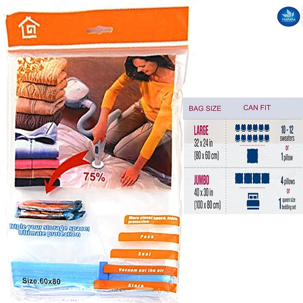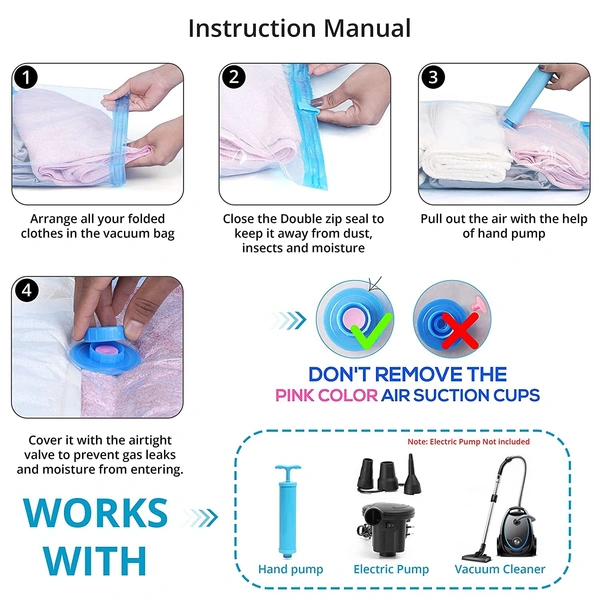 - ONE PACK FITS ALL: There are 4 different sizes available with singles & Combo’s as per your requirement to store away all your seasonal apparel, Sheets, Blankets, Pillows, Comforters, and Stuffed Toys.NOTE : Please pinch the zippers to make sure they are totally clipped and do not take off the pink gasket. Otherwise, bag cannot be vacuumed n